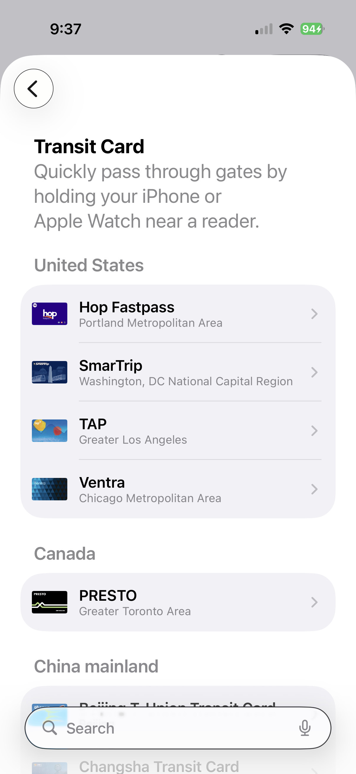 iPhone Wallet shows short transit card list for US