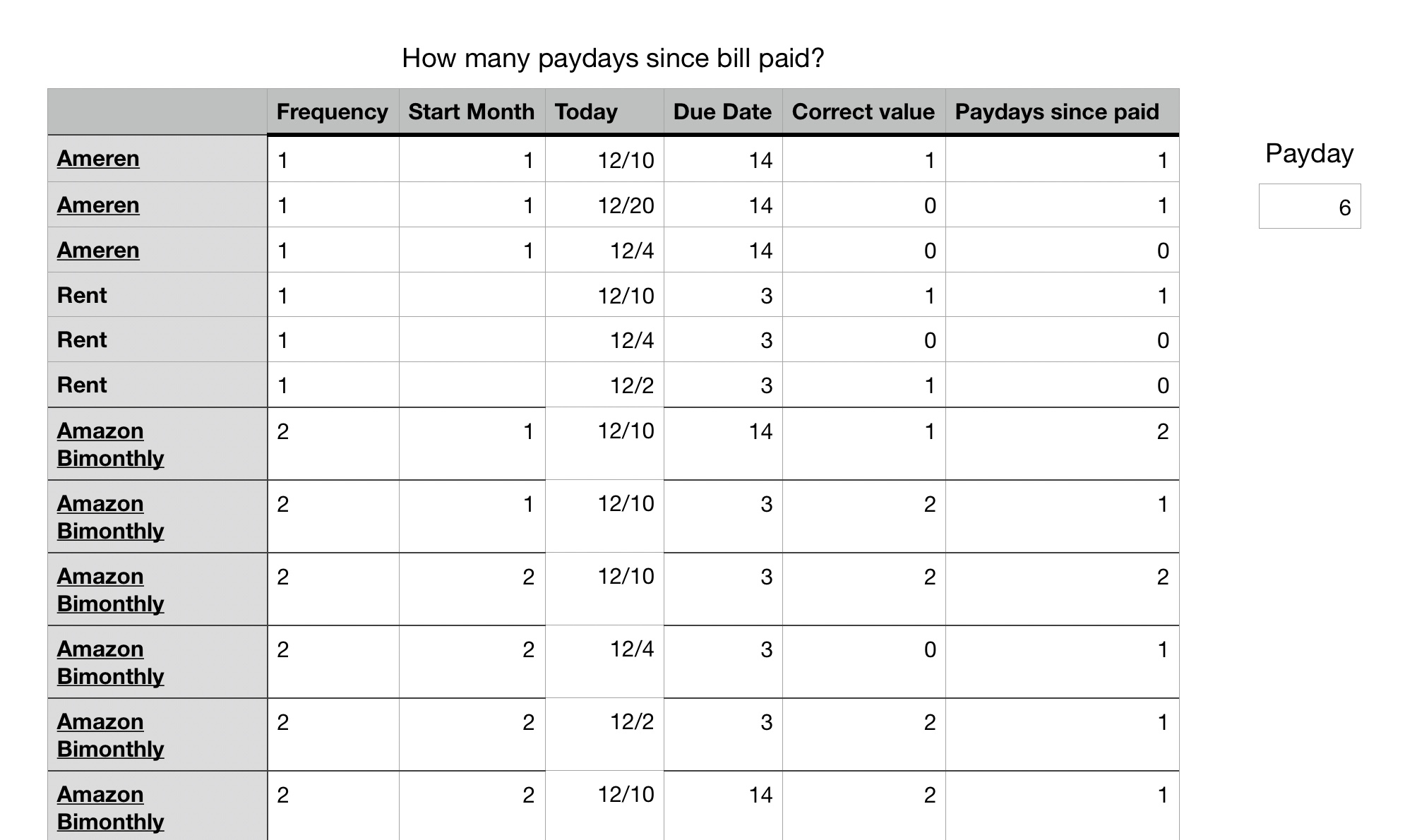 I want a cell that calculates how many paydays have occurred since a bill was last paid. I have monthly, bimonthly, semiannual, and annual bills (I actually also have a semimonthly bill, but I just made it into two monthly bills). I keep trying different things, but it always gets something wrong.