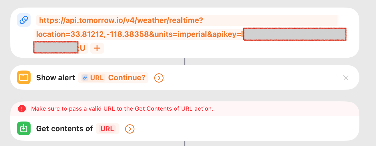 The action "Get Contents of URL" can take either a variable (from the URL action, as in my example above) or a string-defined value, as shown below. In both cases, the URL has to be in a proper form/syntax as per HTTP and the website: