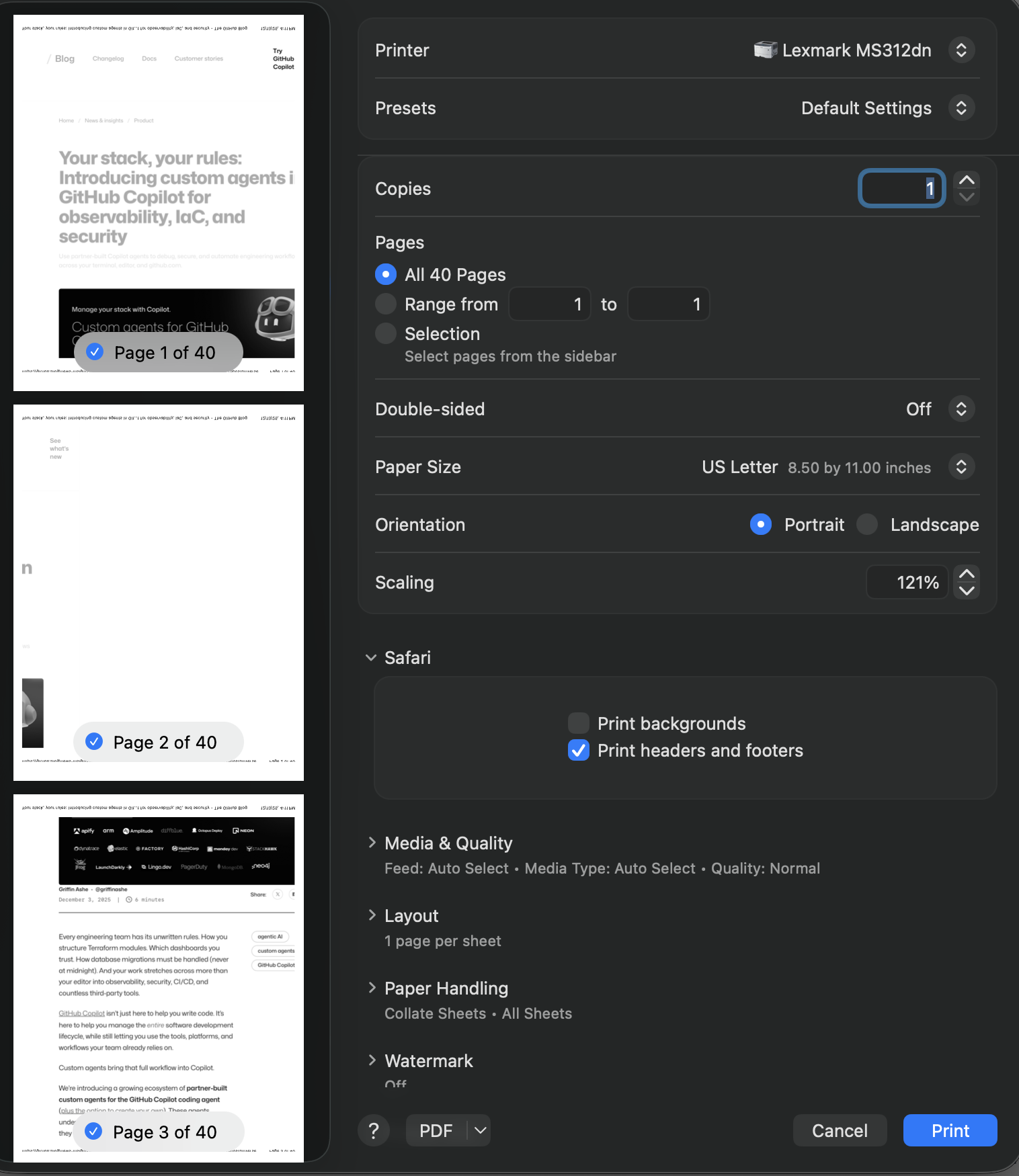 While printing a web page I often need to enlarge the font size so the text is more readable on paper. The current behavior in safari is about scaling (more or less akin to enlarging an image) and it does not attempt to enlarge the font. So the feature request / use case is about safari enlarging the text size and effectuating that during the print operation.
