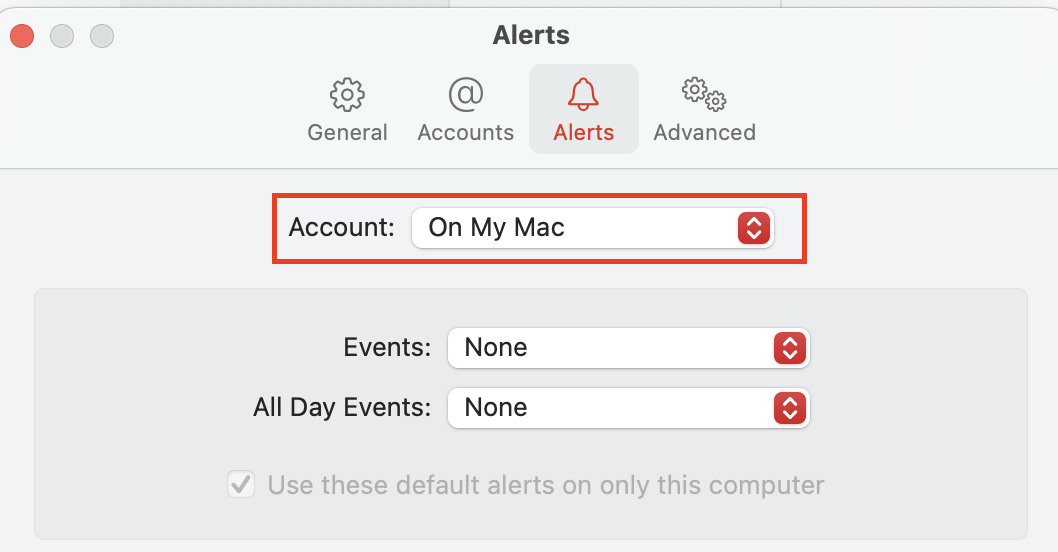 - Default alerts are also set to “None” in iCloud Calendar settings in a web browser