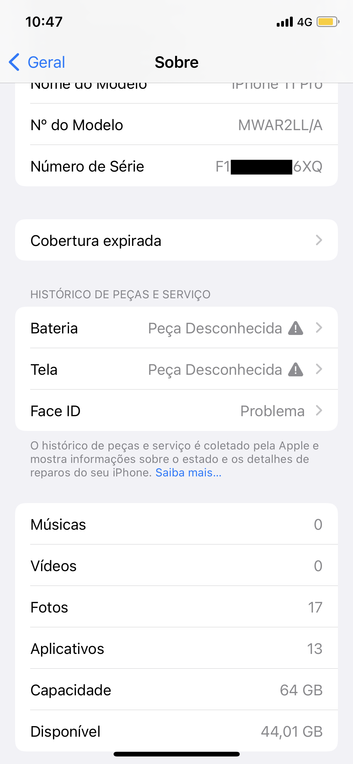 O histórico de peças e serviço será exibido somente se uma peça do iPhone tiver sido substituída ou se uma peça não estiver funcionando como o esperado. Se uma peça tiver sido reparada mais de uma vez, apenas o serviço mais recente será exibido.