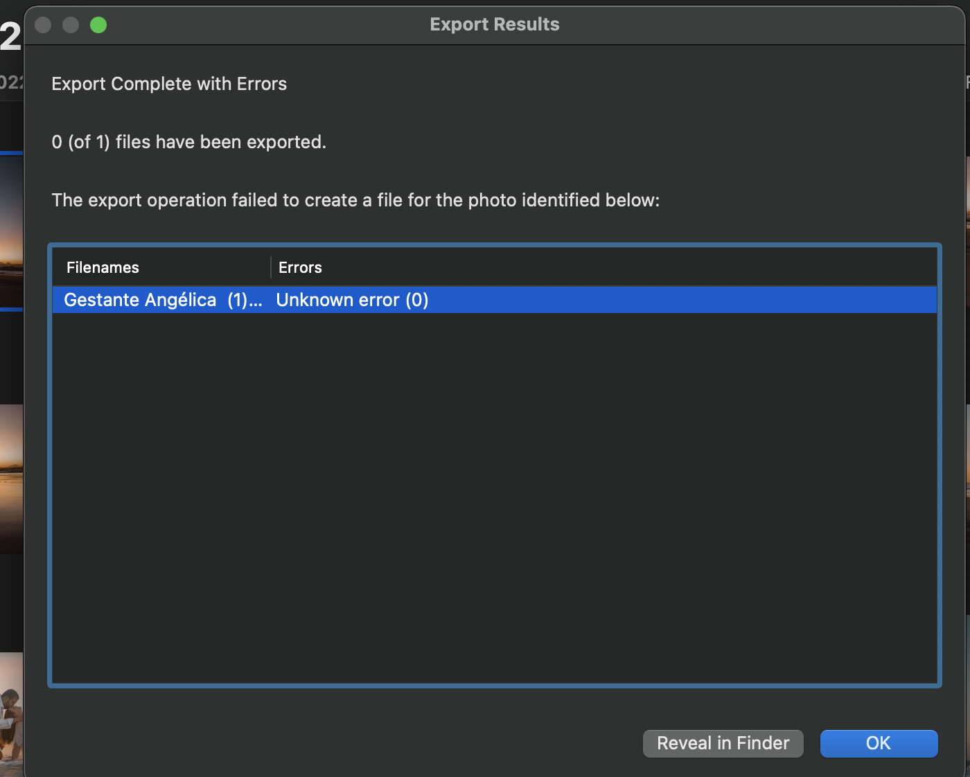 Ao tentar exportar algumas fotos do app no MacOS, a mensagem "unknown error"aparece e a foto não é exportada.
