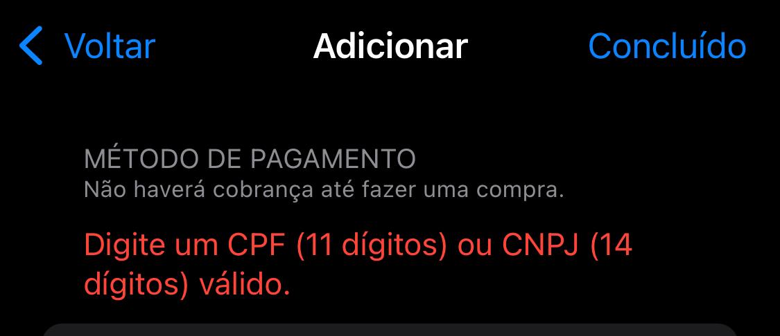 Estou tentando adicionar um meio de pagamento a app store e apple pay, mas o mesmo não aceita meu CPF, mesmo estando correto. Aparece a mensagem no print em anexo.