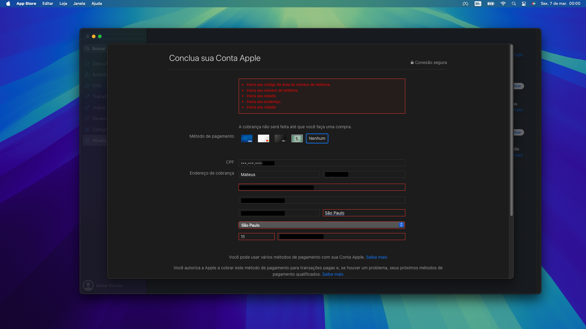 Estou recebendo erro ao tentar realizar a submissão do formulário de endereço de cobrança para conseguir iniciar a sessão no App Store.