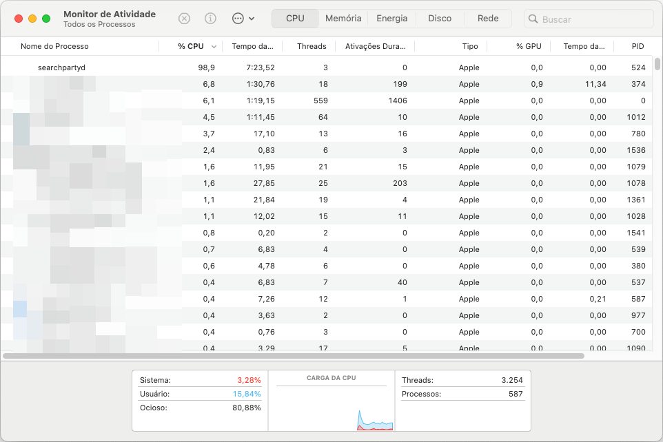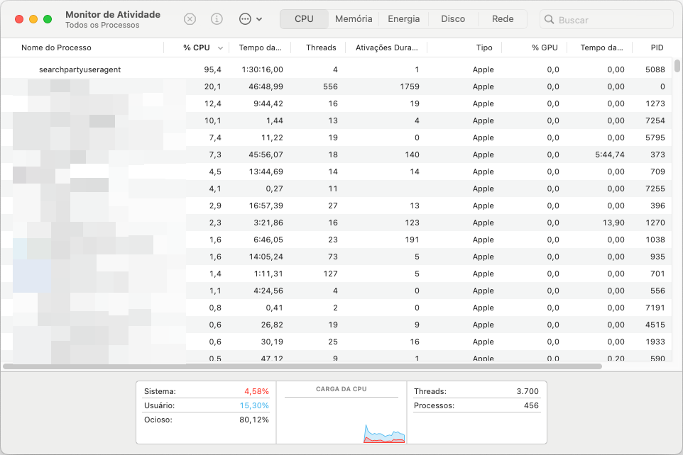 Desde que atualizei meu Macbook Air M2 para o Sequoia (15.1) até agora (15.3), todo dia após ligá-lo inicia um processo chamado "searchpartyd" ou "searchpartyuseragent" consumindo por volta de 90~100% da CPU e fica lá rodando indefinidamente.