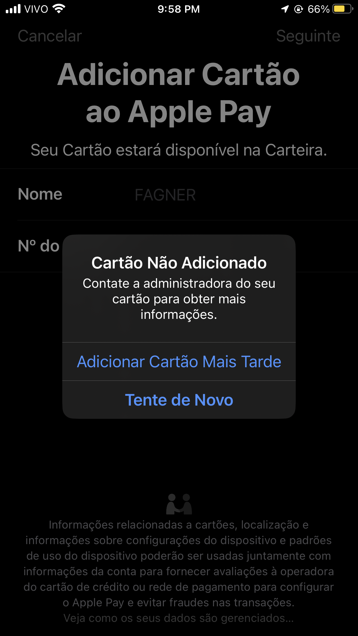 'Cartão Não Adicionado. Contate a Administradora do Seu Cartão para Obter Mais Informações". Ja falei algumas vezes com o Santander. Nada errado lá. Eu consigo add normalmente em outros iphones, mas no MEU nao, ou seja..NÃO TEM NADA errado com meu cartao/banco (se fosse erro no cartao nao conseguiria add em outros aparelhos). Esta td atualizado. Ja fiz restauração de fábrica, como sugeriram em outros post aqui na comunidade, e nada. Oh stress.