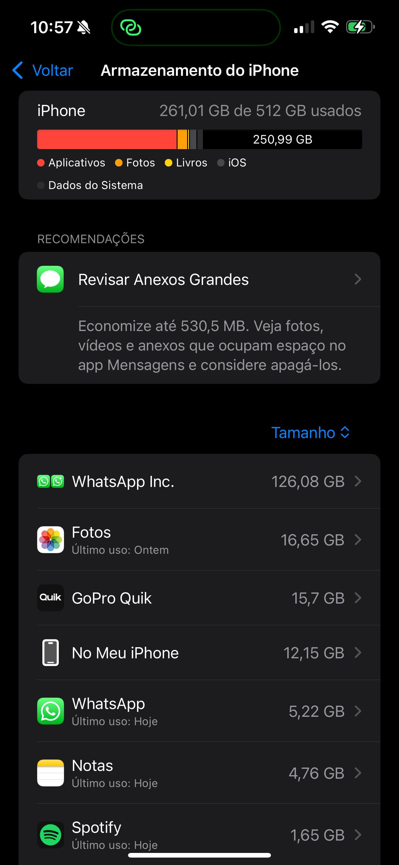 o armazenamento dele esta 261,01 ocupados de 512gb, com sobra de 250,99 conforme anexo