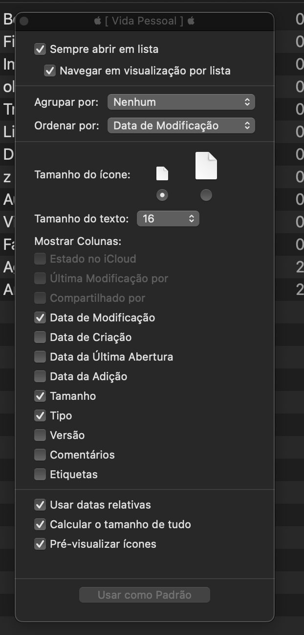 Aperto command J, seto as configurações do visual do finder e clico em Usar como Padrão.