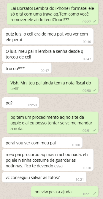 Credenciais do Proprietário Original: Você contatou o proprietário, mas, como a sua conversa demonstra, ele não se lembra da senha do ID Apple associado ao aparelho. Sem a senha, este caminho torna-se inviável.