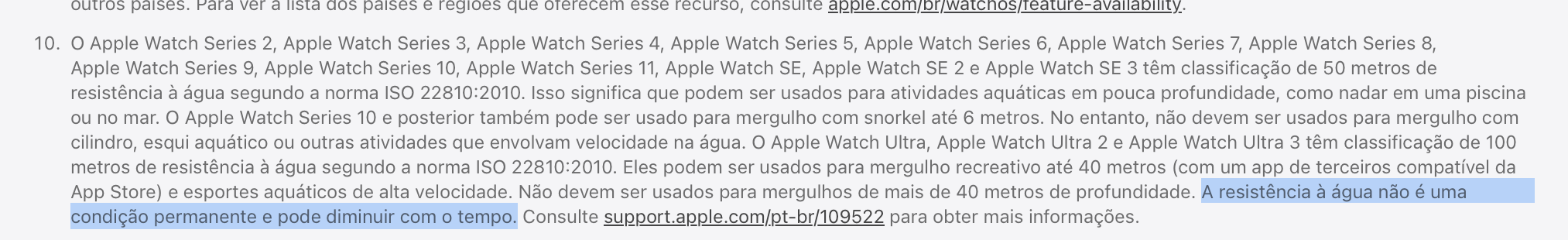 ”O Apple Watch Series 2 e posterior pode ser usado para atividades em águas rasas, como nadar em piscina ou mar, mas você não deve usar outros modelos além do Apple Watch Ultra ou posterior para mergulho, esqui aquático ou outras atividades que envolvam submersão abaixo de profundidade rasa ou água em alta velocidade.”