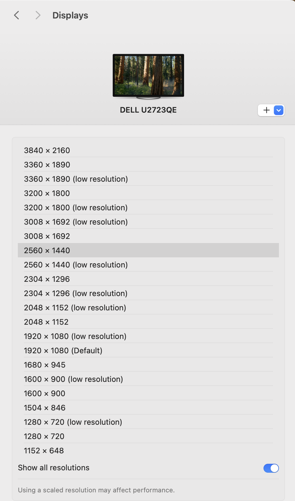 Now we see a bunch of "(low resolution)" choices, too – e.g., "1920 x 1080 (low resolution)" where the Mac draws things at a 1920x1080 (not 3840x2160) level of detail.