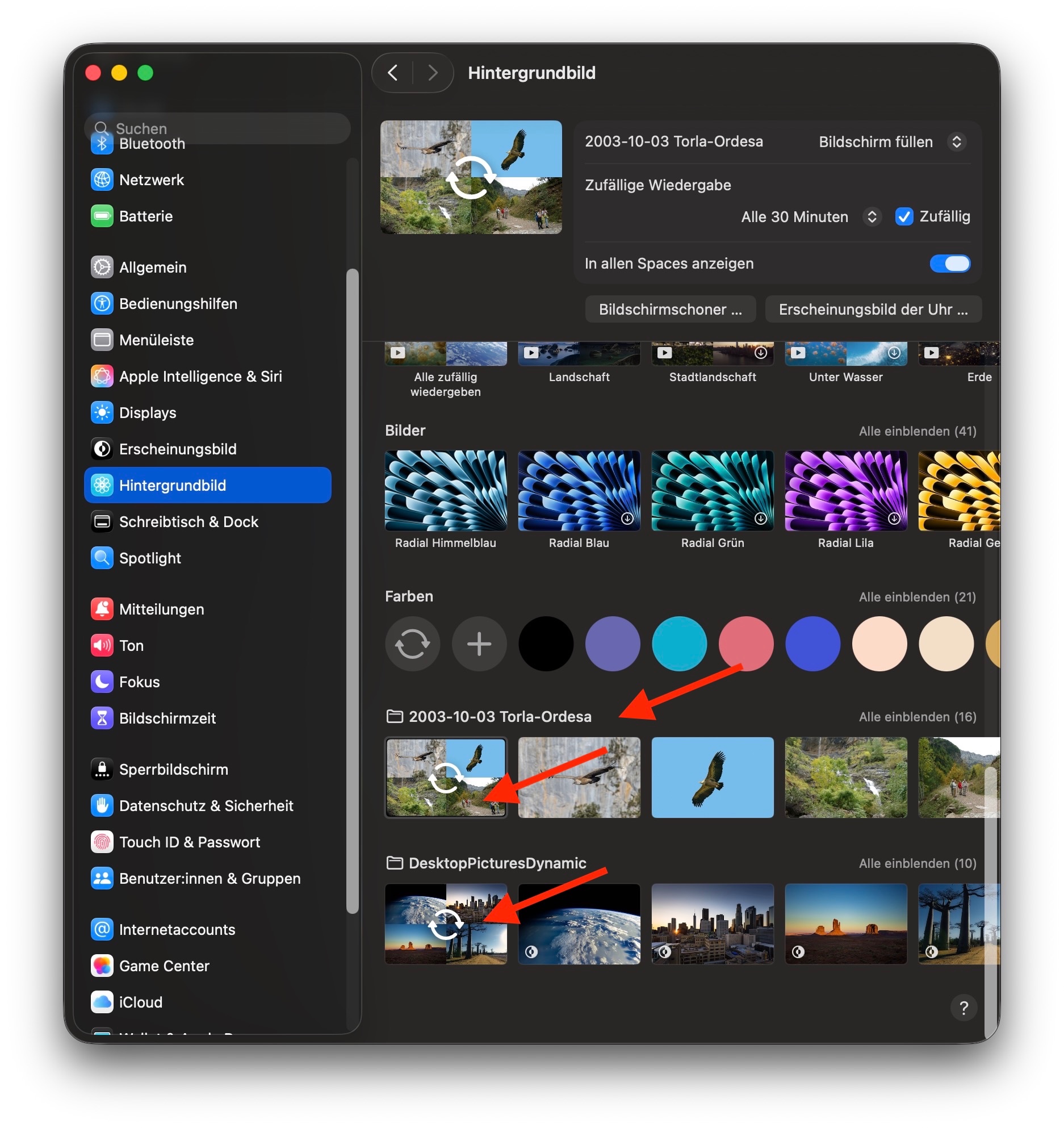 I have added two different folders with wallpapers, both are working well, one with dynamic backgrounds, one with still frames. Sorry, my Mac is set to German, but the screenshot will show you where to look for your added folders, below the solid colors: