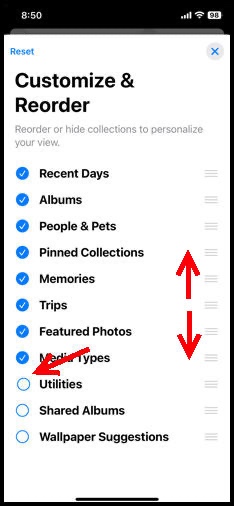 I'm not sure what you mean by "Photo Groups," but at the bottom of Photos is "Customize & Reorder." That menu allows you to move sections around and/or cancel the display of sections.
