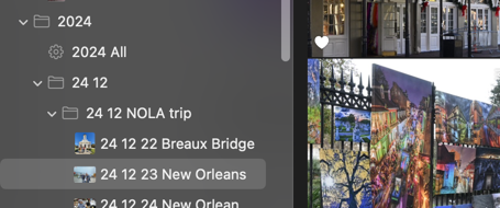 The point is to be able to find what you want. So I have been taking pictures at Horse Shows lately. I have an Album 25 09 03 Horse Classic (say,) but I put that album in the Sept 2025 folder which is in the 2025 folder. I also put it in the Horse Shows Folder. (Duplicating an album makes a copy of the list— it doesn’t make any more pictures.) Some of those pictures are in the Best of 2025 Album in the Best Folder. And, because HorseShow is a Keyword, I can grab them with a Smart Album in my "Temp Smart" folder. And, in the Library view, I can turn on the HorseShow Filter and the Favorites Filter to see the best horse show pictures. One of those pictures is in maybe 4 albums and how many folders?