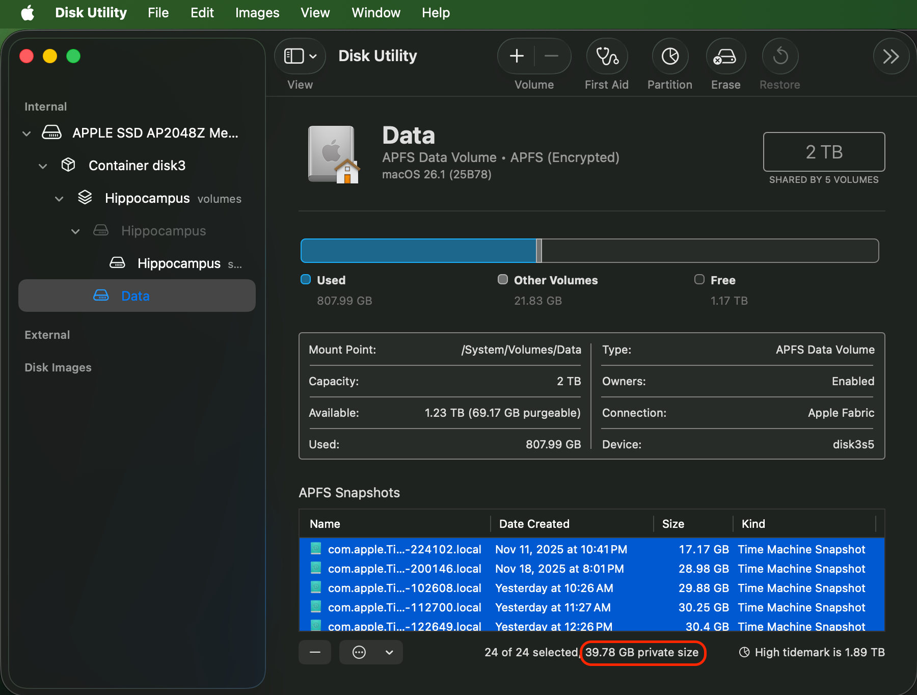 Bigger picture, personally I have no issues with TM backups to a Synology DS223j. Five Macs in the house back up to it, and I also have a set of 4 TB SSDs that I use as secondary backups and connect once a week to run a backup then swap the SSDs to an office location (that's why my list of snapshots in the screenshot above has one from 11/11 and 11/18, those are the last successful backups to the SSDs and the others starring with 'yesterday' are the past 24 hours that are also backing up to the NAS).