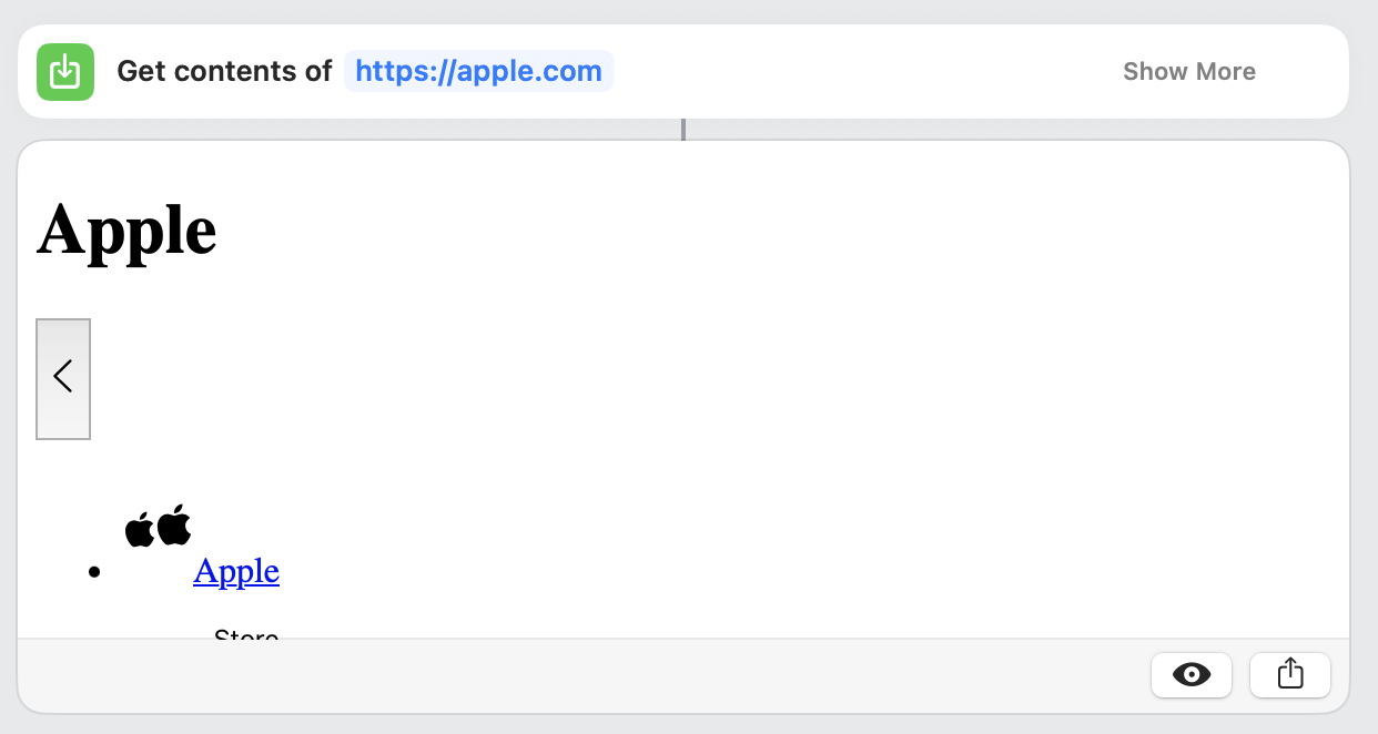 The action "Get Contents of URL" can take either a variable (from the URL action, as in my example above) or a string-defined value, as shown below. In both cases, the URL has to be in a proper form/syntax as per HTTP and the website: